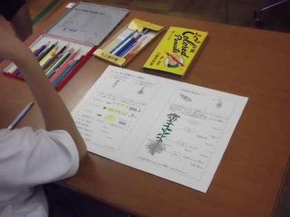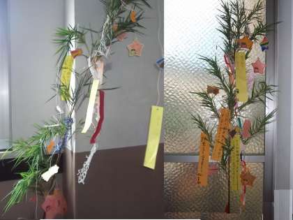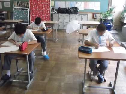 テストと授業のようすです。外の廊下に目をやると、自分たちの作った短冊が笹に飾られてました。みんなどんな願いを書いたのでしょう?先生も一枚参加させて貰いました。