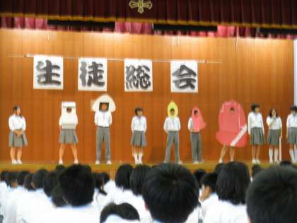 7月4日(木)の生徒総会では、どの委員会も、積極的に代表者が出て目標や活動状況をわかりやすく発表しました。その中にも多数の二年生が、次代の山中を担う意気込みを見せ、いろいろな工夫を凝らし、あるいはセリフを覚え、頑張っていました。