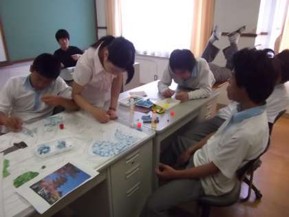 タイトルも自分で考えます。ちなみに2間稲の写真は「ランバード」とか。早くできた人は隣の教室で「貼り絵」の作業です。