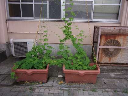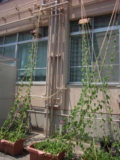 一気に暑くなった今週、緑のカーテンもぐんぐん成長しました。朝顔ですが、これは沖縄あたりの品種でしょうか、成長が早いです。写真は、左が昨日で右が今日の撮影です。