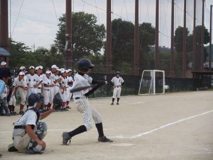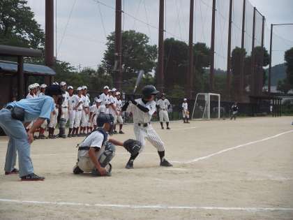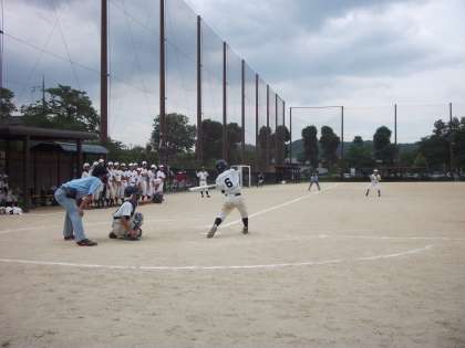 山科中が1点を先制し、中盤から終盤に掛けては、1点を巡る攻防でした。特にランナー一人おいて3塁打を打たれ、1点は取られたと思ったのですが、相手のミスに助けられ、0で抑えました。そして1対0のまま終盤へ。