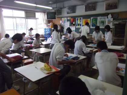 3年生は美術です。先生から夏休み課題の説明があった後、それぞれの作品に取り組んでいます。