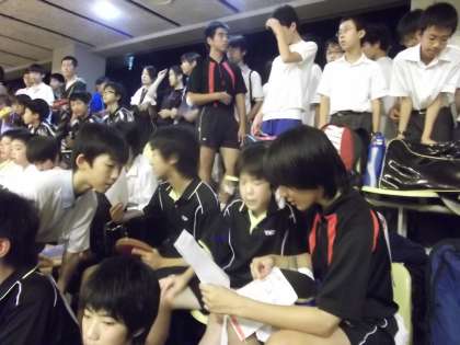 今日から各会場で夏季大会がスタートし、本校は男女卓球部が伏見港公園体育館、男女バスケットボール部が府立体育館、野球部が勧修グラウンドで大会を行っています。伏見港体育館に応援に行きました。電車で行くと自動車では出会えない風景に会えて、「ちょっと小旅行」みたいな気にもなりました。観覧席があまり大きくない体育館なので、全市から集まると熱気でムンムンです。写真に収まった女子のキャプテン、力強く「頑張ります!」と言ってくれました。