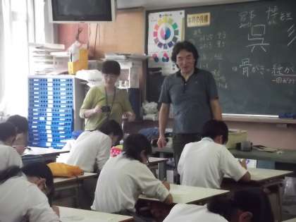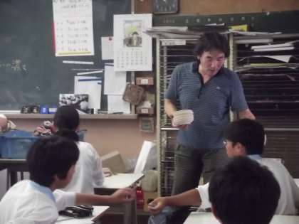 今週から1年生の美術の時間で、清水焼絵付けを行います。初回の今日は清水焼団地より陶芸作家の宮本博先生に来て頂き、1年1組を指導をしていただきました。