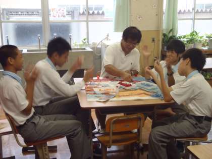 1年生は学年劇の準備、展示発表の準備とそれぞれの教室に分かれて活動。ここは大道具の準備です。8組は貼り絵が完成に近づいてきました。