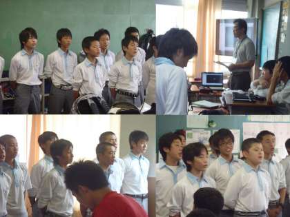 5時間目、2年生は男女それぞれ二つずつのグループに分かれ、2階と3階で学年合唱曲の練習でした。先生の指導にも熱が入ります。