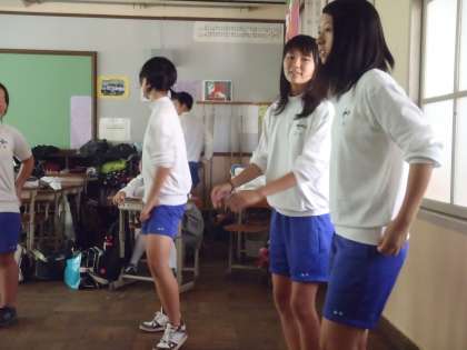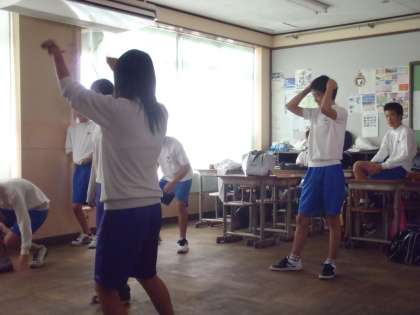7組の教室では「一世風靡セピア」みたいな?ダンスの練習中でした。振り付けも相談しながら練習です。