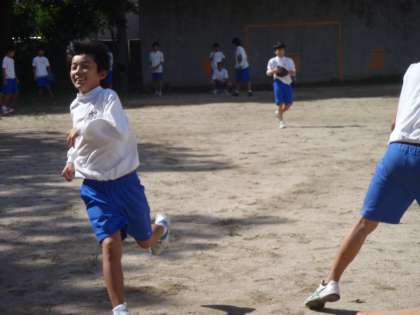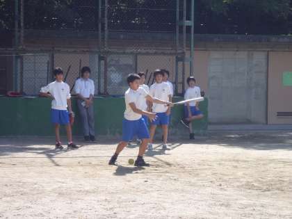 2年生1・2組の男子はグラウンドで教育実習の田原先生によるソフトボールの授業です。最初はボールも重く、なかなか外野まで飛ばなくて、ゴロを打っては1塁へ全力疾走です。