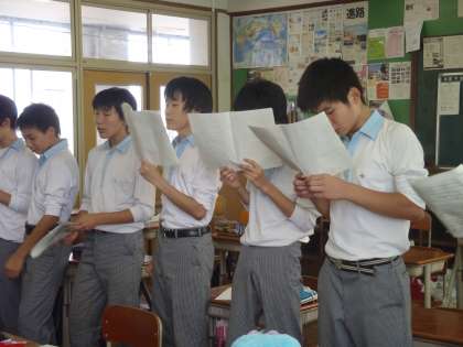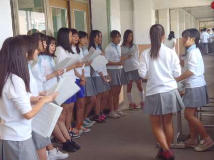 今日の取り組みの時間、3年生はどのクラスも教室と廊下、階段でパートごとに分かれて合唱の練習です。