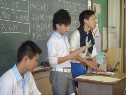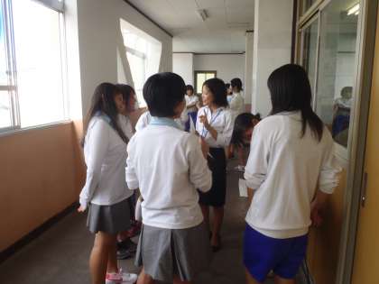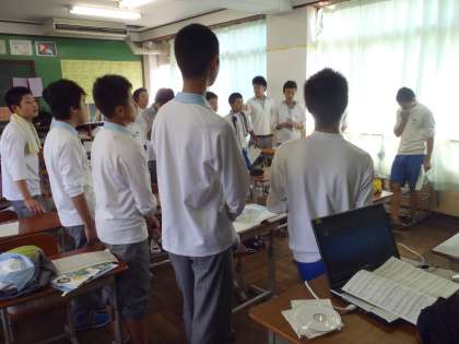よく見てみると廊下や階段で練習しているのは女子が多く、デッキを囲んでしっかりパート練習。男子はだいたい教室で練習をしていて、しかもそこには必ず担任の先生が・・・?。1組は教育実習の北村先生も頑張ってます。