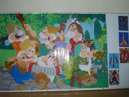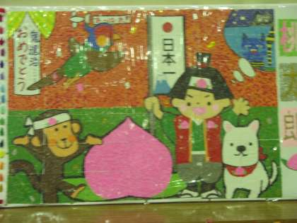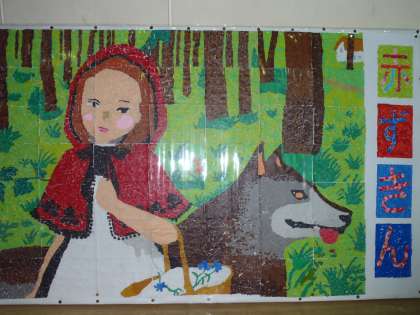テーマは「童話の世界」です。1年生の学年劇に登場する「赤ずきん」、「桃太郎」、「白雪姫と七人のこびと」を題材にしています。