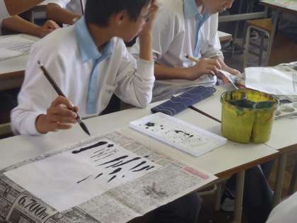2年生は「水墨画」を描くための下準備です。墨(墨汁)が跳ねたり、机に零したりと、なかなか落ち着かない面もありますが、作業が始まると集中してやれていました。来週が本番になるクラスもあるようでどんな作品が出来るのか楽しみです。
