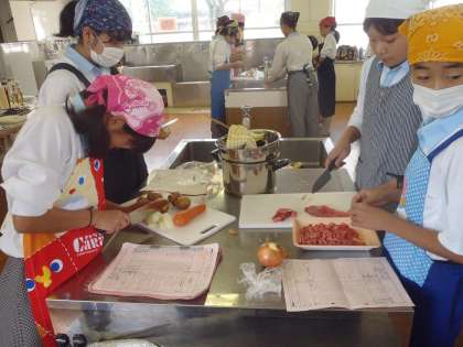 今日の3組を皮切りに調理実習が始まります。メニューは「肉じゃが」で食材を見ているだけで美味しそうです。生徒たちは普段包丁など握ったこともなさそうで、なかには「お肉て洗うんやった?」という声も・・・・。途中までしか居なかったのですが、きっと美味しくできたでしょう。