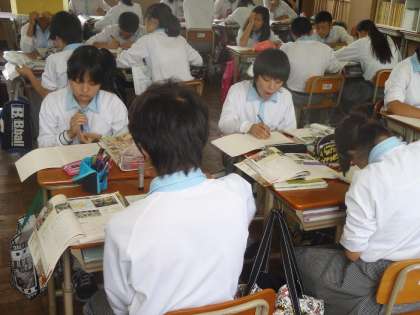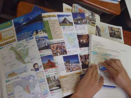家庭学習で予習をしてきた事柄をもとに、まず自分で資料の写真やグラフを見て考え、4人グループで意見を出し合い発表します。