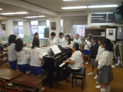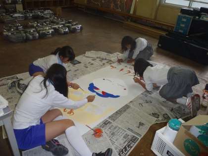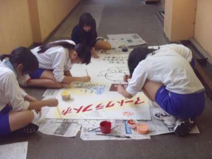 放課後の4号館、1階では運動部が着替えたりと活動中。2階は合唱部と美術部が活動しています。合唱部はパート別の活動のあと、全員そろっての練習です。美術部は「清水焼郷まつり」(10月18日〜20日で本職の方の作品に混じって、1年生と美術部員の絵付け皿や茶碗なども展示されます)から看板の追加依頼があったようで、その作成です。