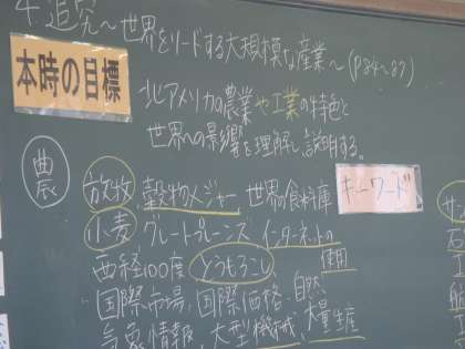 社会は地理の時間、世界に影響を与えるアメリカ合衆国の農業の特徴を調べるということでグループ学習でした。ある班では「綿花は雨が多くて温かいところ、放牧は西経100度より西の乾燥したところ」というふうに調べてます。