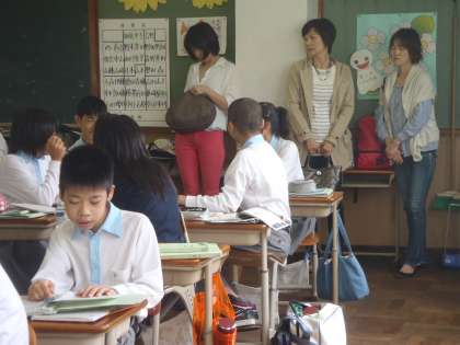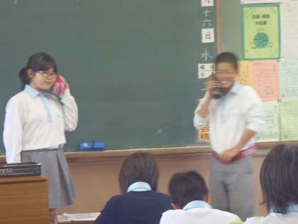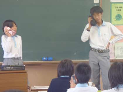 ペンケースなどを携帯電話代わりにして、結構楽しそうにやっています。二人のやりとりを他の生徒が評価します。