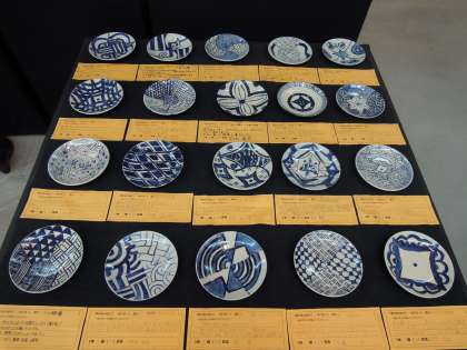 展示された、1年生の清水焼絵付け作品の様子と陶芸作家の方々が作品を見てくださっていました。