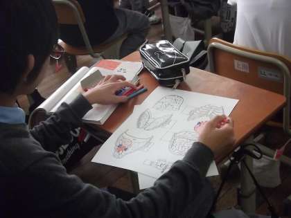 紙の部品に色鉛筆で色を塗りますが、他の臓器と重ならないように自分で色を決めて塗っていきます。さてどの色にするかな?