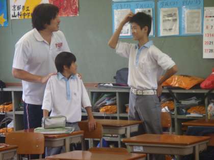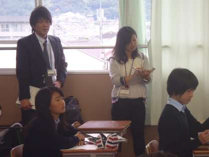 小学校の先生も熱心に見てくださっています。練習の文を大きな画面に映し、顔を上げ発声が出来るようにします。