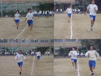 2年生の体育、男子は40メートル走、助走を付けた40メートル走と50メートル走を計っていました。6秒台の生徒は,さすがにスピード感がありました。