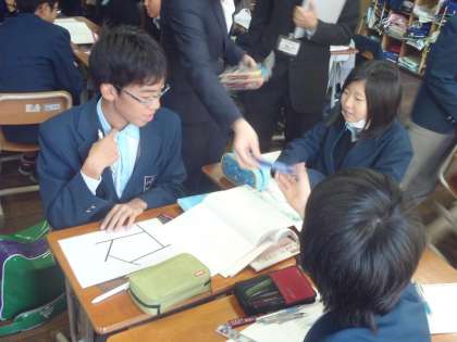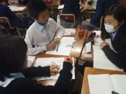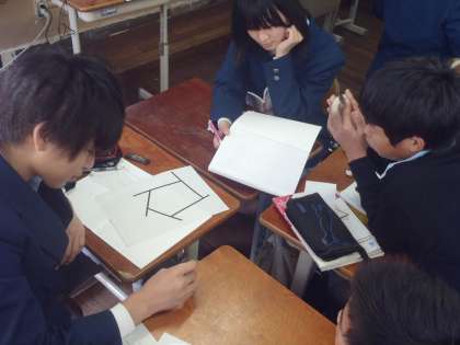 五角形の場合はどんな式になるか?4人班に分かれてグループで考えます。2年生もいくつかの教科でグループ学習に取り組んでいるため,生徒たちの話し合いもスムーズです。