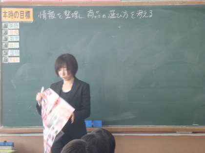 実際の折り込みチラシを見て,何が分かるのかをみんなで出し合った後,自分たちが実習で作った商品(エコバッグ)を買って貰うための宣伝チラシを班で考えます。