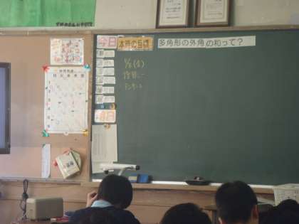 数学は「多角形の外角の和」というテーマで,今日は研究授業本番です。与えられた五角形の外角の和を求める式を見つけるため,グループで考えます。