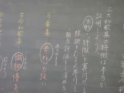 特徴を出し合った後,プリントにそれぞれの和歌の特徴の根拠を教科書や国語便覧も使って探します。感覚で分かっていても言葉にするのは結構難しいようです。