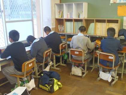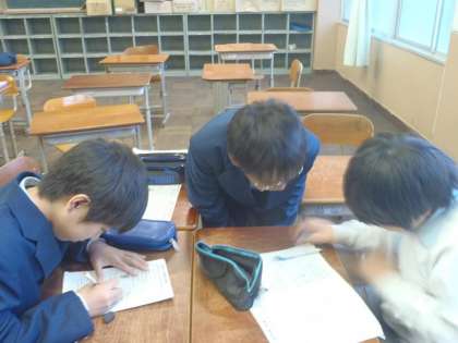 1ー5の教室では,男子が窓や壁に向かって並んでいます。お互いにしゃべらないよう,自分たちで工夫したようです。分割教室の学習会では,お互いに教え合っている姿が目立ちました。