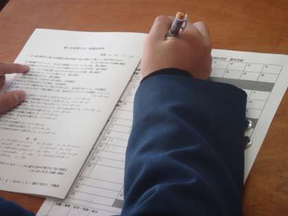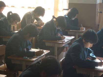 今日から第4回定期テストが始まりました。聞き取りテストの関係で,1時間目は1年が社会,2年は保健体育,3年は理科,8組は国語です。まずは2年生の様子です。