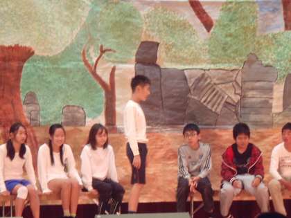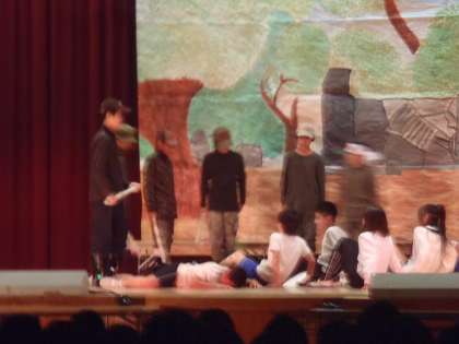 戦時中,好きな外国の歌を歌えずに,無念のうちに死んでいった子どもたち。その思いに触れ,共感しする中で、一緒に「You Are My Sunshine」を歌い平和の尊さを訴えるものでした。観ていて胸がジーンとする,さすがに6年生だなと思う劇でした。