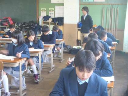 英語のテストです。時間も後半になると,試験問題に行き詰まった人がチラホラ出てきます。先鋭が後ろから最後まで諦めないよう促します。