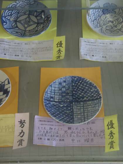 清水焼の郷まつりに展示していただいていた「絵付け皿」の作品を校舎玄関に展示されてます。通ったときや職員室に来たときに観てください。