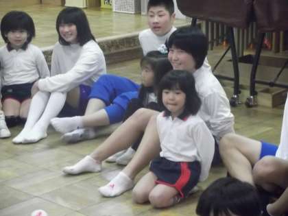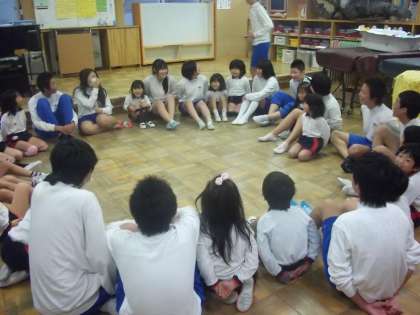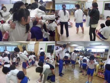 生憎の雨模様で、園児の健康も考え予定を変更して部屋の中での活動になりました。まずはお決まりの「おんぶ」で触れあって,和んだところで「ハンカチ落とし」ゲームが始まりました。
