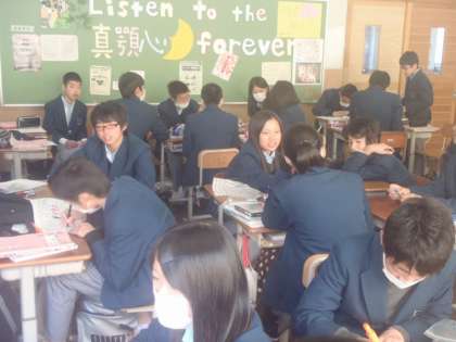 1組の授業は家庭科で,広告のチラシを考える授業です。4人ずつのグループになり,被服の実習で作ったエコバッグの宣伝を考えます。