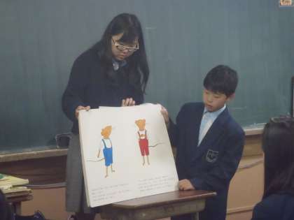 1年生は明日の山階南小学校への読み聞かせ活動に向けて,放課後の練習です。本番直前ですが,「顔を上げて」「声をしっかり,はっきり,ゆっくり」とか,まだまだ指導が入ってます。