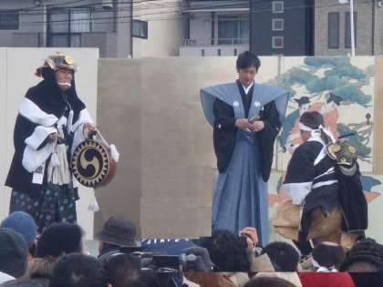 山科地域女性会の踊りに続いて,東映太秦撮影所の役者さんが演じる,浅野内匠頭切腹シーン。連判状改めの場面には山科区長さんも出演です。