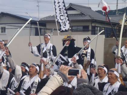 最後は吉良邸で上野介を見つけ,勝ちどきを上げる場面です。行列はこの後,百々学区の大石神社まで続きます。そちらでは子ども歌舞伎が演じられ,また,百々学区の女性会を中心に甘酒などが振る舞われるそうです。今年は地元赤穂でもお祭りがあるそうですし,キアヌ=リーブス主演のハリウッド映画も公開されるようで,注目が集まっているかもしれませんね。