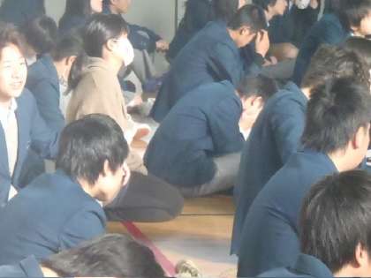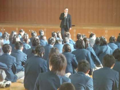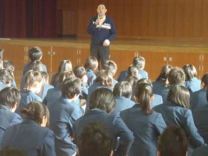1限目3年生は体育館で集会。入試や学年末テストに向けての学習のこと、進路についての注意点、冬休みの生活のことなどについて、各先生方から話しがありました。