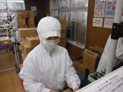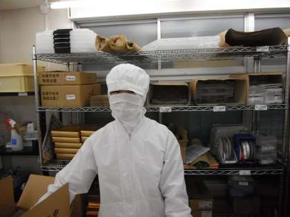 顔が見えない!でも衛生管理はバッチリです。ここはマールブランシュさんですが,食品関係の事業所ではこういう衛生管理の清潔さを学ぶのも大切ですね。