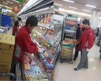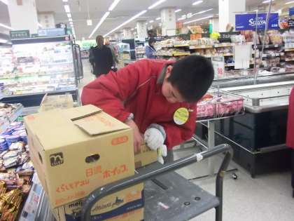 食品売り場で、お店の方に教えて貰いながら商品の陳列、結構難しいです。