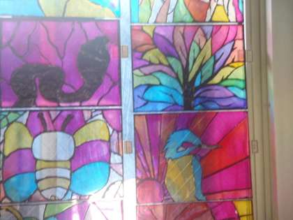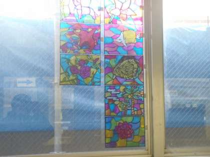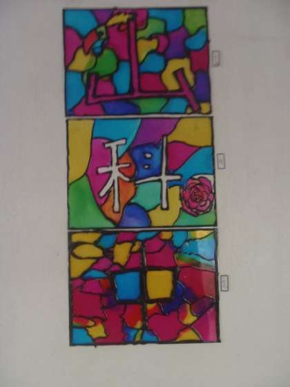 4号館の1階廊下の窓に、3年生の美術作品「ステンドグラス」展示され始めました。まだ全てのクラスではないようなので、追々紹介していきます。校舎が壁面工事中でシートで覆われていて、光が少ないのが残念です。