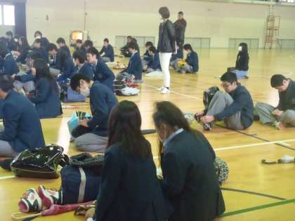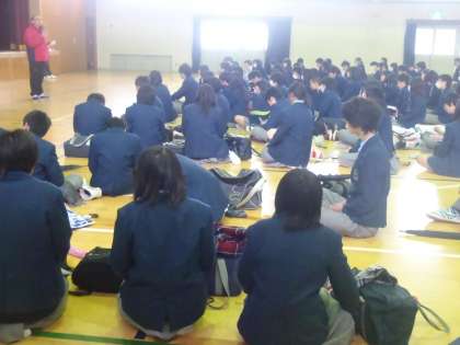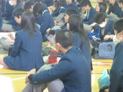 2月14日体育館で公立前期を受ける生徒に学校長の激励と進路主事の先生より諸注意が行われました。週明けの17・18日が本検査です。