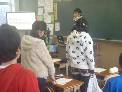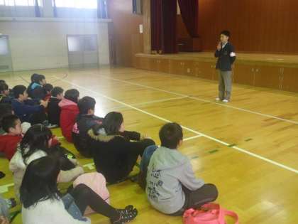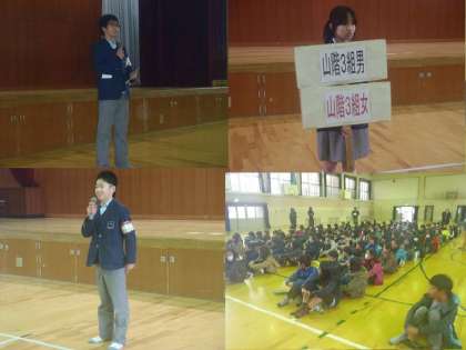 山階南小学校、百々小学校の順に時間差を付けて体育館に集合してもらいました。生徒会本部からあいさつがあり、その後生徒会本部、評議員の生徒がプラカードを持って、各体験教室に案内します。