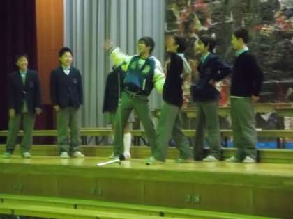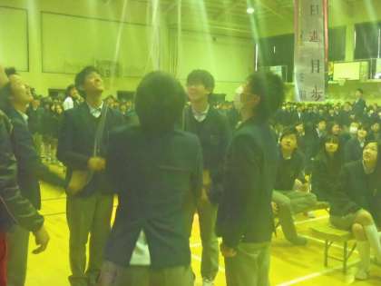 まずは3年生による「クス玉割り」で始まり,生徒会から息のあった「漫才」と「コント」や歌が披露されました。