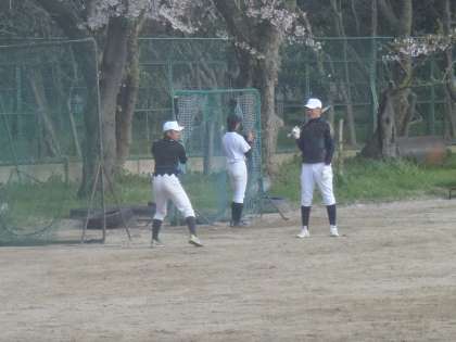 冬に戻ったかのような寒い風が吹く中,グラウンドでは野球部が元気に活躍中です。野球部は,練習を見に行くと,いつも大きな声で「こんにちは!」と挨拶をしてくれます。今日は卒業生も体を動かしに来てくれていました。