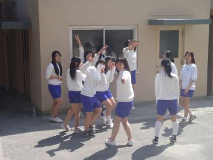 放課後,堤防では駅伝競走部が練習をしています。中庭では体育館を待つ間、女子卓球部が練習前にポーズをとってくれました。