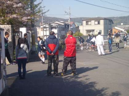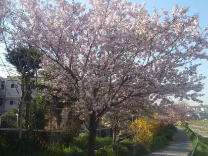 朝の校門付近,春の日差しが強く,みんな眩しそうにしてましたが,元気にあいさつをしてくれます。気持ちよく一日が始まるのは大切なことです。校庭の桜は散りましたが,すぐ横の堤防では遅咲きの桜が綺麗に咲いています。