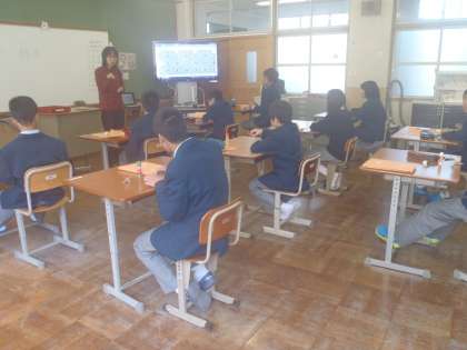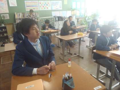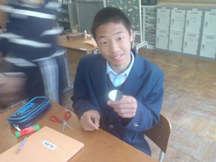 8組は理科の時間でした。白と黒の色だけで模様が描かれた円盤で駒を作って回すと,他の色が見えてくるという実験でした。みんな不思議そうにしています。